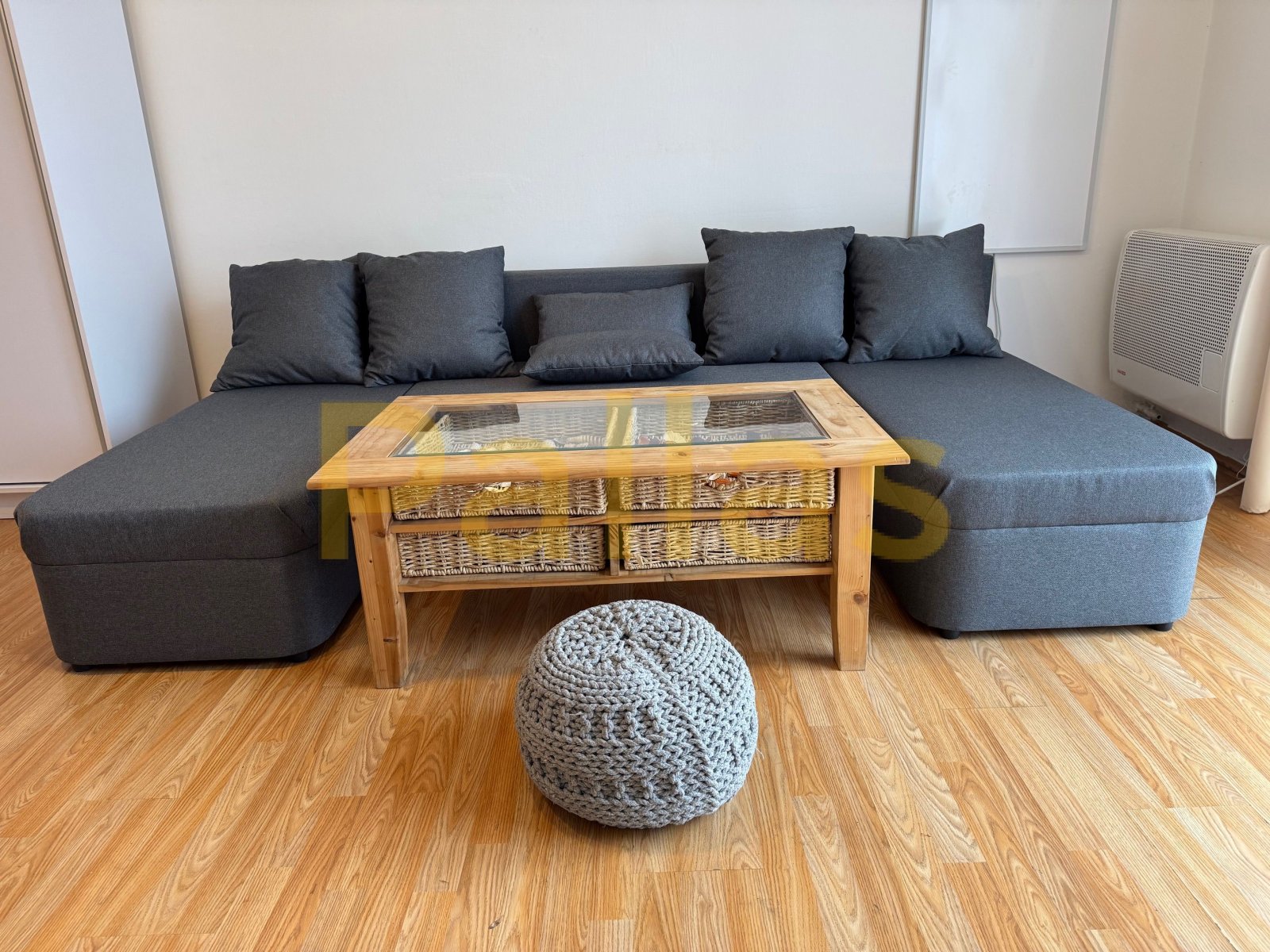 • obývacia časť s novou šedou rozkladacou sedačkou a s TV prijímačom